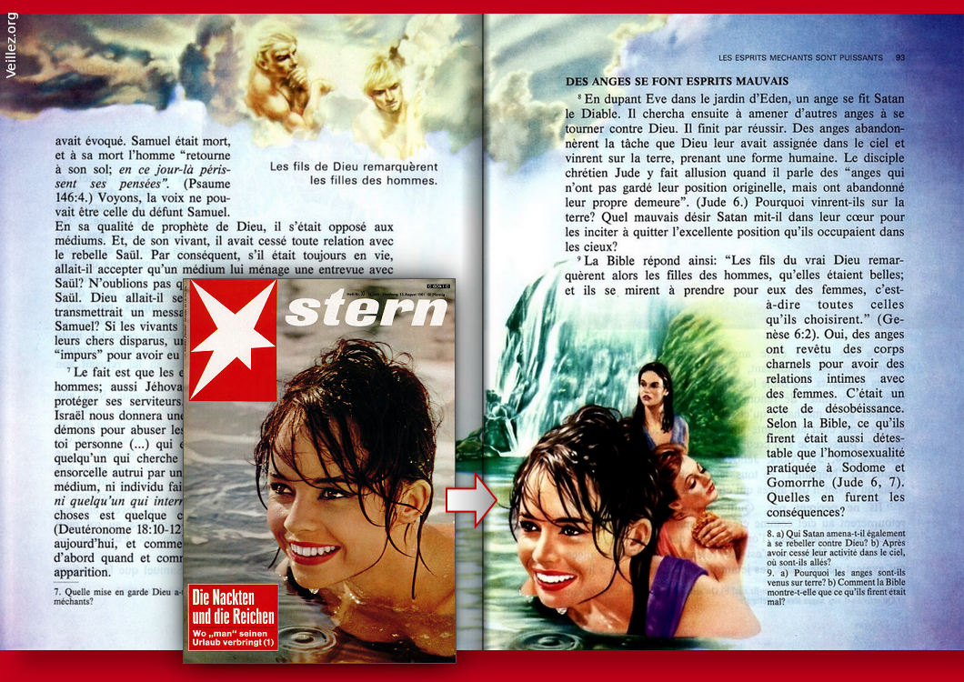 En comparaison, ci-dessous l'illustration concernée par cet ancien livre d'étude, pages 92 et 93 ; c'est le chapitre qui parle des anges rebelles, qui convoitèrent des femmes pour s'accoupler :