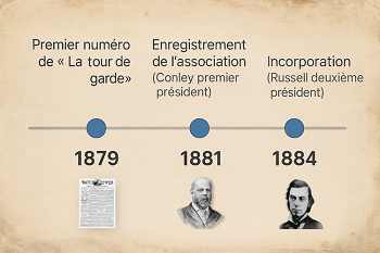 Pourtant, en 1881, la société existait déjà comme une association religieuse structurée, ‘légalement enregistrée’ selon les normes de l'époque. Son premier président n'était pas Charles Taze Russell, mais bien William Henry Conley. Il finança largement les activités initiales, participa à l'organisation et à la diffusion des premières publications, et travailla étroitement avec Russell, qui était alors secrétaire-trésorier. En 1884, la Watchtower obtint le statut de corporation, ce qui permit à l'organisation de bénéficier de droits juridiques : posséder des biens, publier sous son propre nom, signer des contrats. Mais ce changement de statut, essentiellement administratif, n'altéra en rien la nature de l'entité : elle demeurait une association religieuse à but non lucratif, fondée sur les mêmes principes et poursuivant les mêmes objectifs.