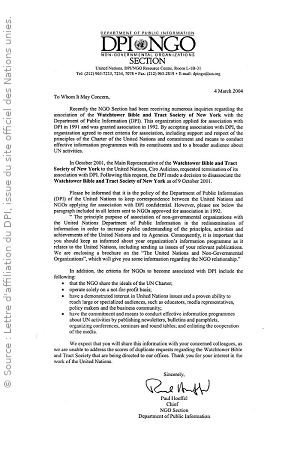 Aussi, dans la lettre officielle du DPI disponible sur le site de l'ONU, il est expliqué que la demande d'affiliation de la WTBTS fut faite en 1991, et obtenue en 1992.(1)